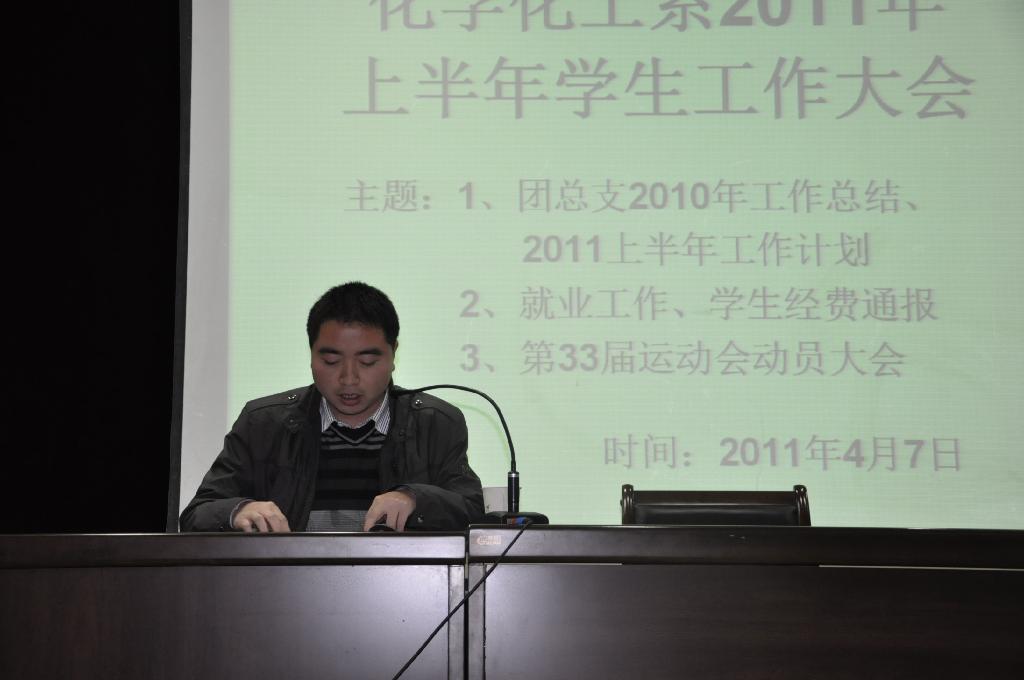 首先,化学化工系团总支书记张建东汇报了上学期团总支、系分会工作,重点介绍了学风教育、感恩教育活动、诚信教育、老员工科技创新、安全教育、常规管理、趣味运动周、敬老院送温暖、以及元旦晚等活动。随后,对本学期的工作进行了规划,对即将举行的运动会作了相应部署。