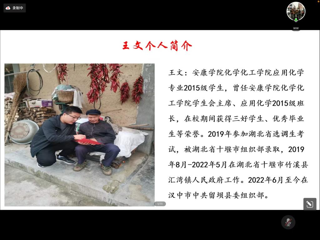 王文,2019届应用化学专业毕业生,在校期间担任班长、团总支员工会主席,获得校级三好员工、优秀员工干部、优秀毕业生等荣誉,现就职于汉中市留坝县委组织部。