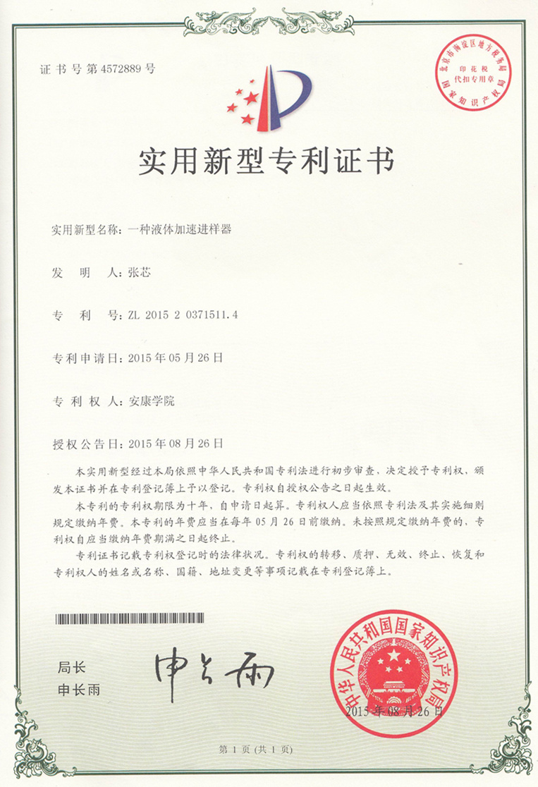 日前,以伟德bv国际体育作为专利权人,化学化工系教师张芯作为第一发明人申请的实用新型专利“一种微型全自动中空纤维膜测试平台”、“一种液体加速进样器”,相继获得国家知识产权局授权,并获得专利证书,专利号分别为ZL 2014 2 0865489.4和ZL 2015 2 0371511.4。