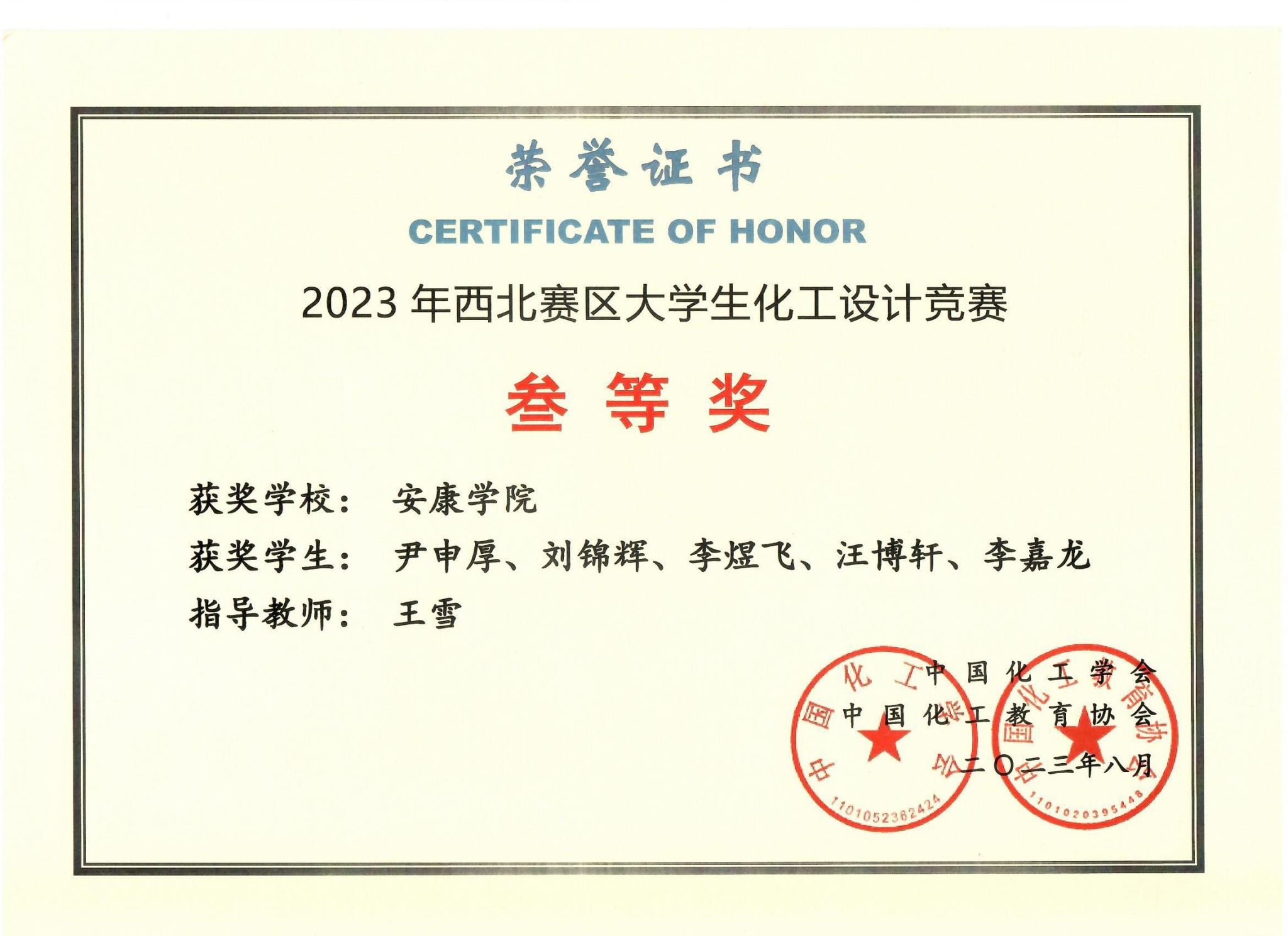 本次竞赛以“为某大型化工企业设计一座用于己二腈清洁生产的分厂,要求技术符合我国绿色低碳循环发展要求”为主题,吸引了来自全国各地的优秀学子积极参与。经过激烈的角逐,公司化学工程与工艺专业2020级员工郭佳欣、张希越、张智明、樊天祥、孙玮琦组成的“化学分子队”获得了全国二等奖,尹申厚、李煜飞、汪博轩、李嘉龙、刘锦辉组成的“腈彩杰伦队”获得了西北赛区三等奖。