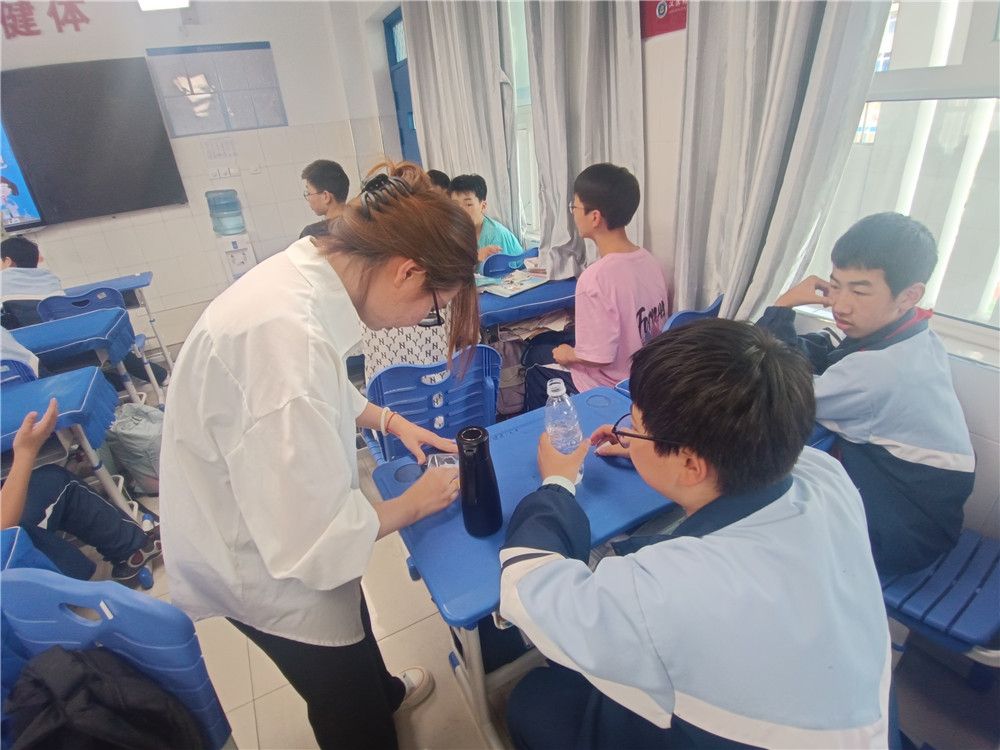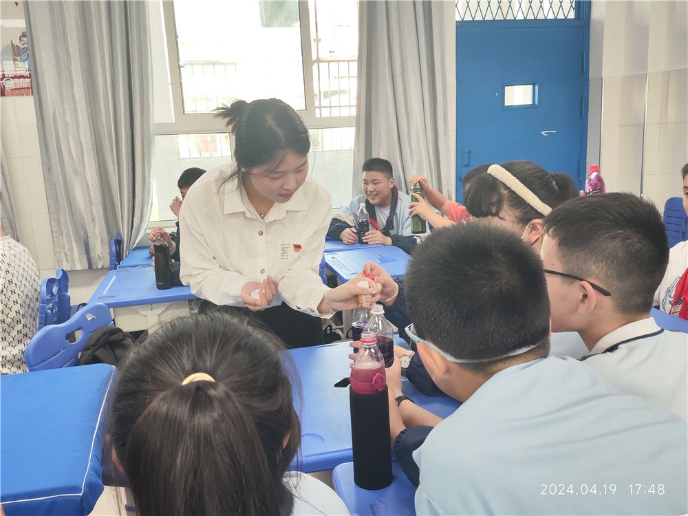 接着袁光辉、王晓林、王雪三位老师向同学们展示“掌中火”和“神奇的变色”两个富有趣味性和观赏性的实验,并邀请同学们上台亲自动手体验。最后,老师与科普团成员及员工党员们为同学们发放实验所需的高锰酸钾、vc片等实验用品,在三位老师的指导下,同学们一起摇动水瓶,观察水质变色的过程,感受化学反应的神奇魅力。实验过后,袁光辉向同学们解释原理,让同学们在实验中感受化学魅力,培养科学兴趣。