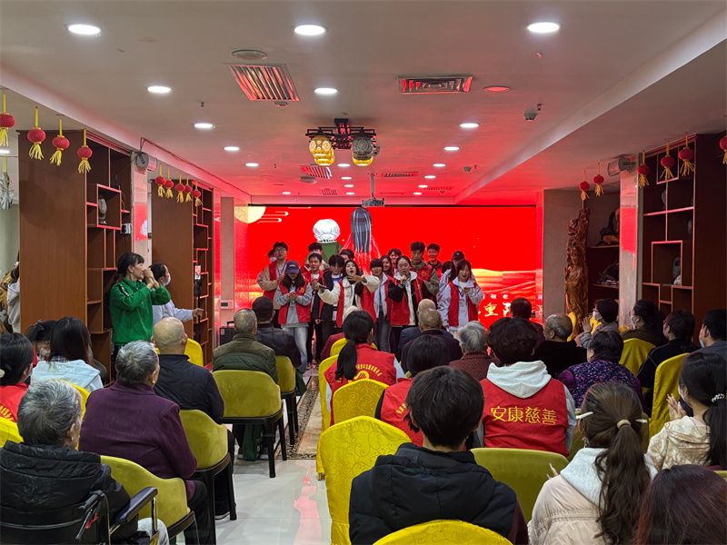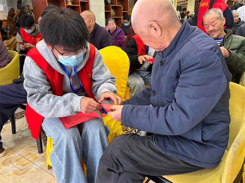 护理院内暖意融融,文艺表演环节更是将氛围推向高潮。激昂的《歌唱祖国》合唱,熟悉的旋律瞬间勾起老人们的青春记忆,不少老人轻声跟唱,有的还轻轻打着节拍。表演间隙,志愿者还与老人们共同开展“指尖传情”手工互动,手把手教老人折千纸鹤、串珠花,彩色的纸花在掌心绽放,也让温暖在彼此心间流淌。活动尾声,志愿者们为老人讲解秋冬季节的养生小知识。